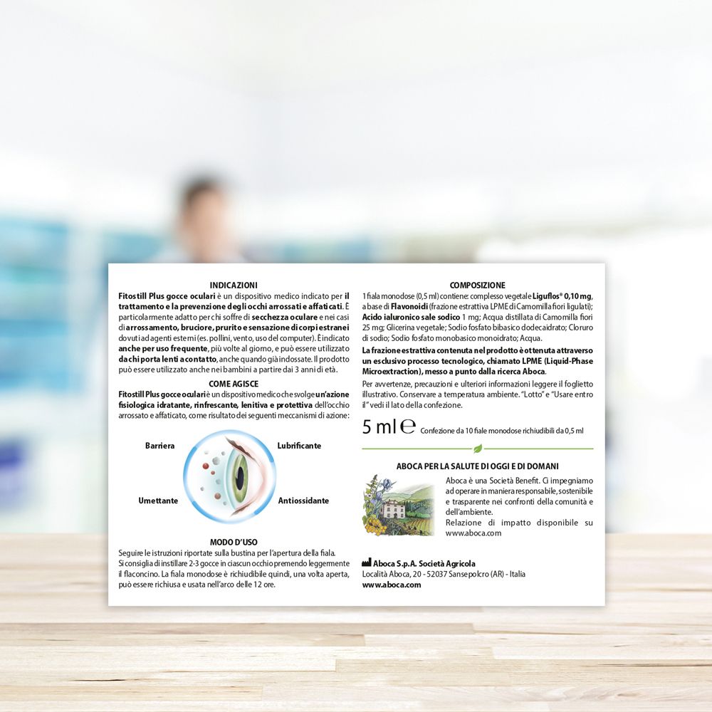 Fitostill Plus gocce oculari è un prodotto a base di Liguflos® e acido ialuronico che agisce ripristinando la naturale funzione lubrificante del “film lacrimale”.